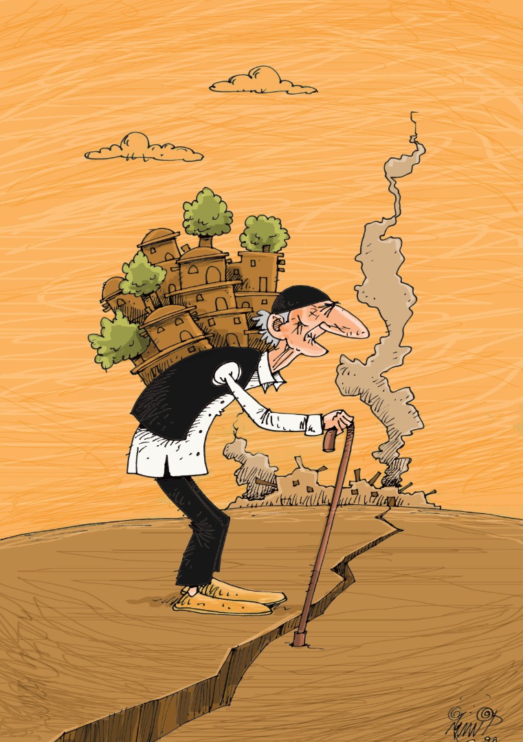 به نظر می رسد که این فرم کار، یک نوع نقد است. شخصیت هایی که به شهر و آنچه رخ می دهد پشت کرده اند و انگار که متوجه زادگاه خود نیستند. این شخصیت ها (حتی کودکان)، به جهان ویران خود چشم بسته اند و با لبخند های خود به خوشبختی تظاهر می کنند در حالیکه بینی اغراق شده، حاکی از دروغ این ادعاست. مردان قوز کرده اند چرا که بیش از حد درگیر مشکلات خود هستند.