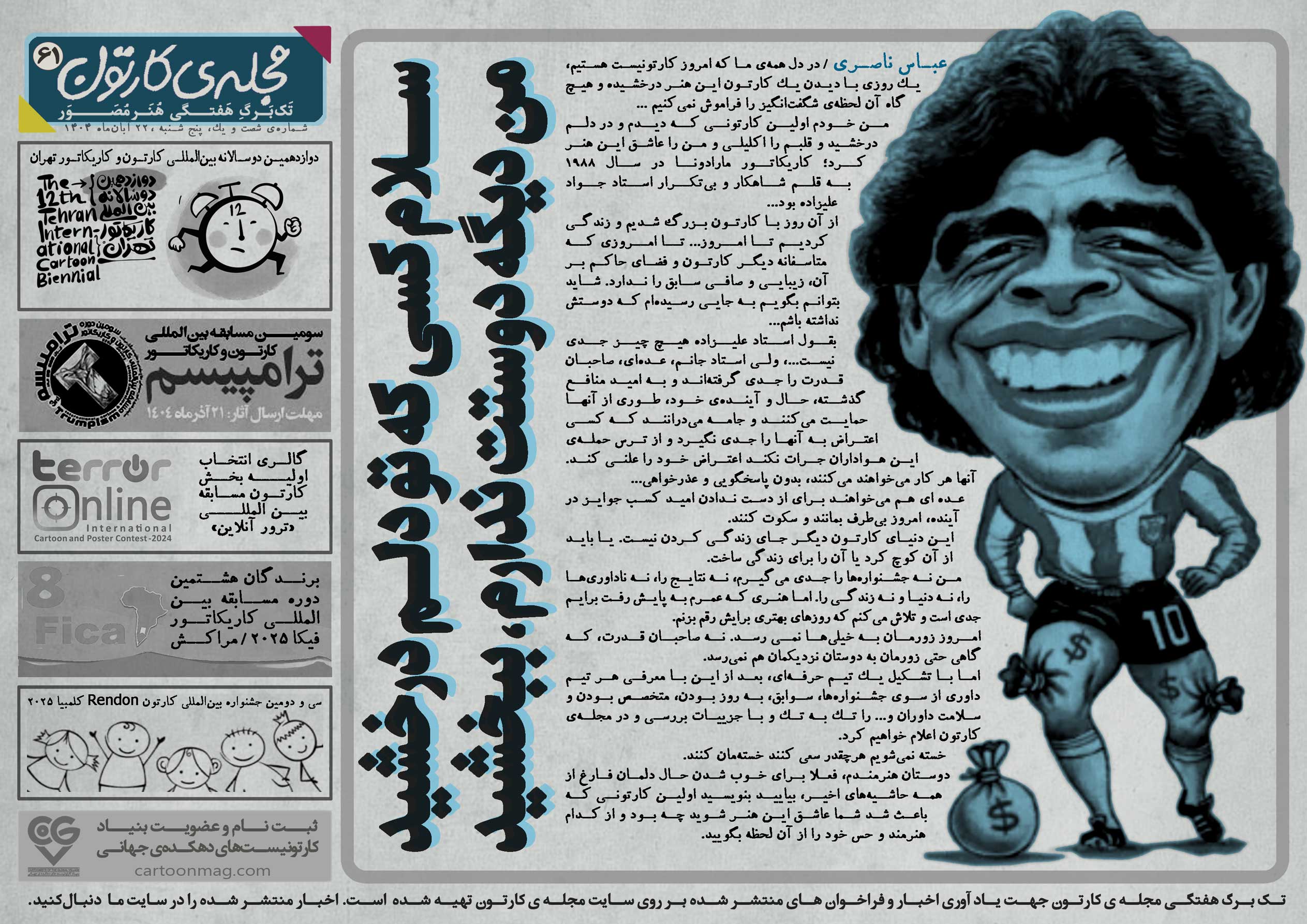 من خودم اولین کارتونی که دیدم و در دلم درخشید و قلبم را اکلیلی و من را عاشق این هنر کرد؛ کاریکاتور مارادونا در سال ۱۹۸۸ به قلم شاهکار و بیتکرار استاد جواد علیزاده بود…