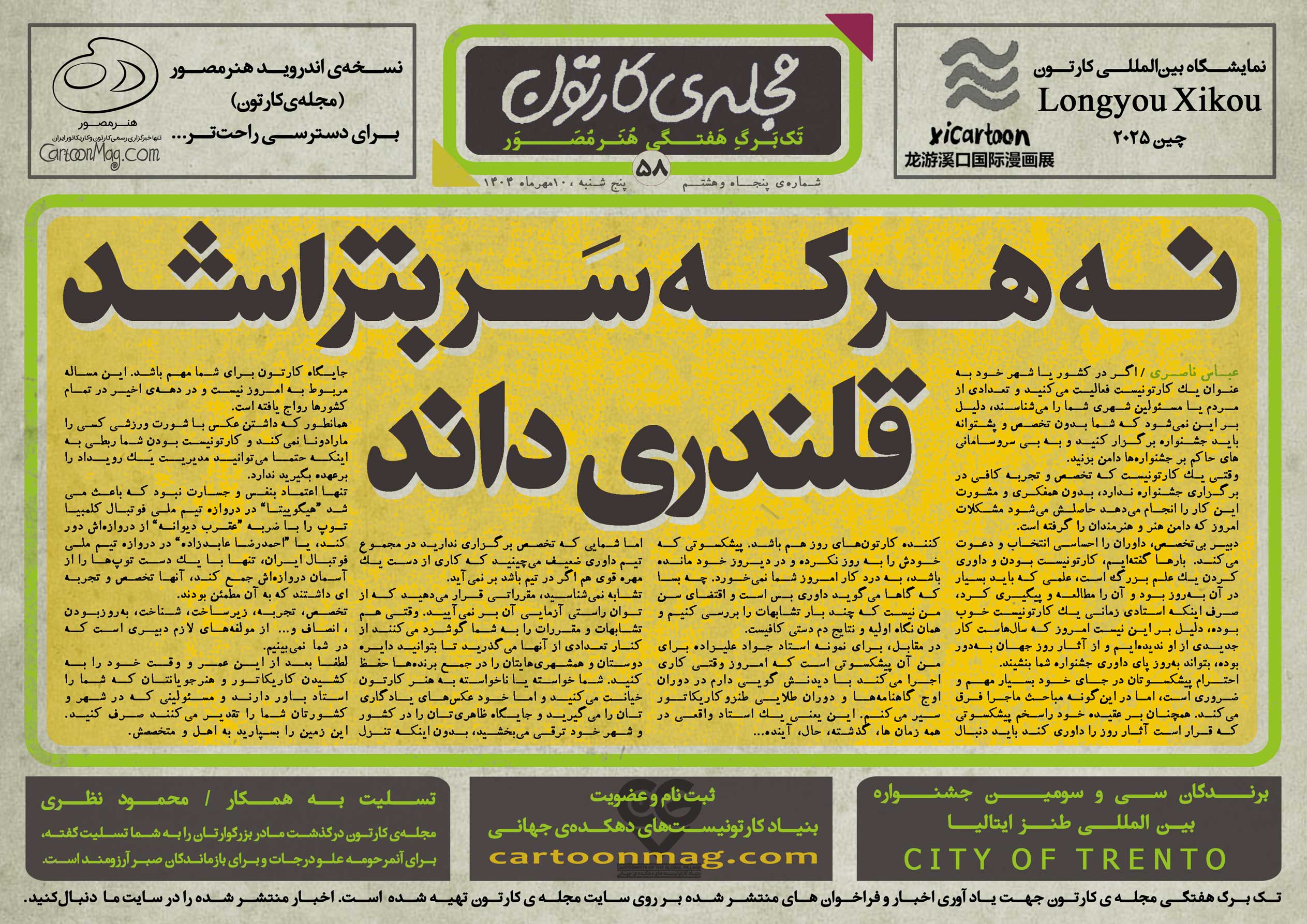بارها گفتهایم، کارتونیست بودن و داوری کردن یک علم بزرگ است، علمی که باید بسیار در آن بهروز بود و آن را مطالعه و پیگیری کرد، صرف اینکه استادی زمانی یک کارتونیست خوب بوده، دلیل بر این نیست امروز که سالهاست کار جدیدی از او ندیدهایم و از آثار روز جهان بهدور بوده، بتواند بهروز پای داوری جشنواره شما بنشیند.