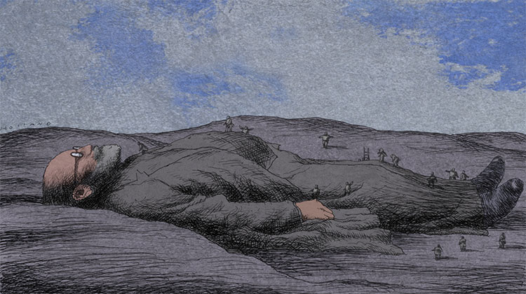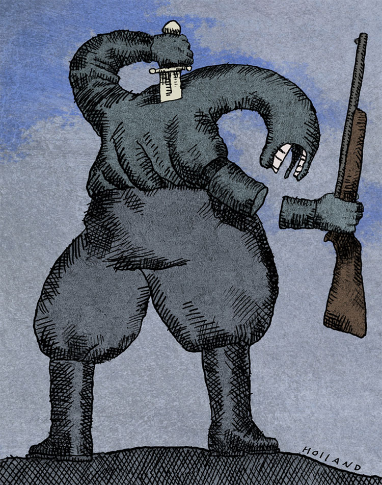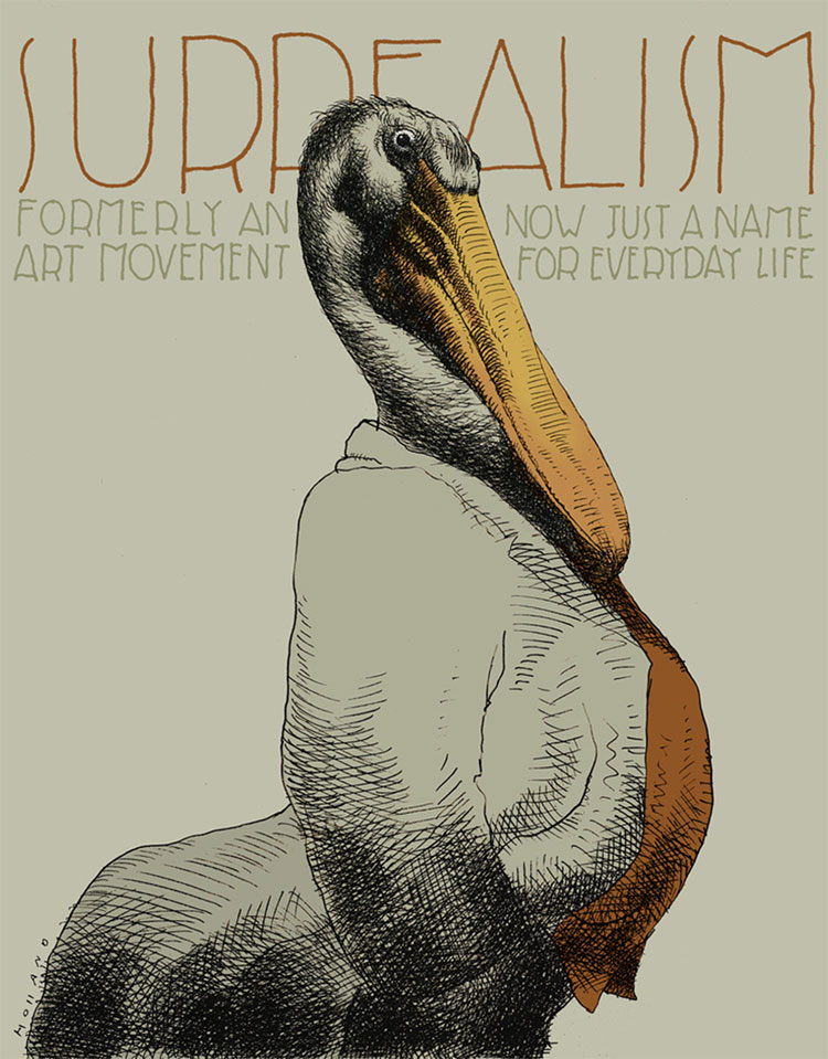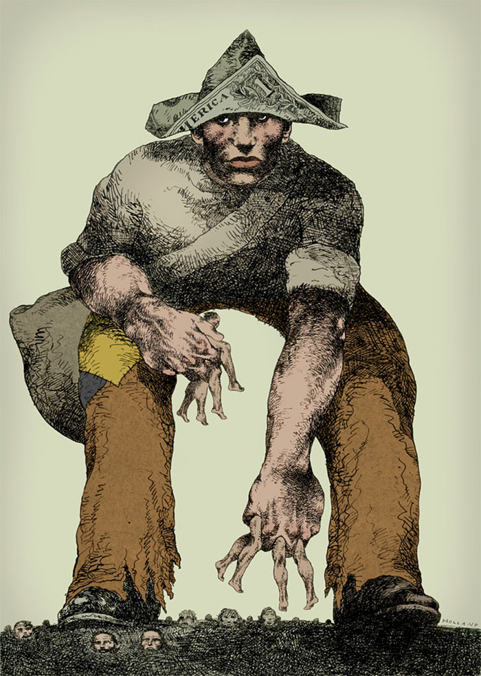 Brad Holland is a self-taught artist and writer whose work has appeared in Vanity Fair, The New Yorker, Time, Playboy, Wall Street Journal, Fortune, Rolling Stone, New York Times and many other national and international publications. His drawings and paintings have been exhibited in museums around the world, including one-man exhibitions at the Musée des Beaux-Arts, Clermont-Ferrand, France and the Museum of American Illustration, New York City. His satire of the art business “Express Yourself, It’s Later Than You Think,” first published in The Atlantic Monthly, has been widely republished, both in print and on the Internet. In 2005, he was inducted into the Society of Illustrators Hall of Fame.