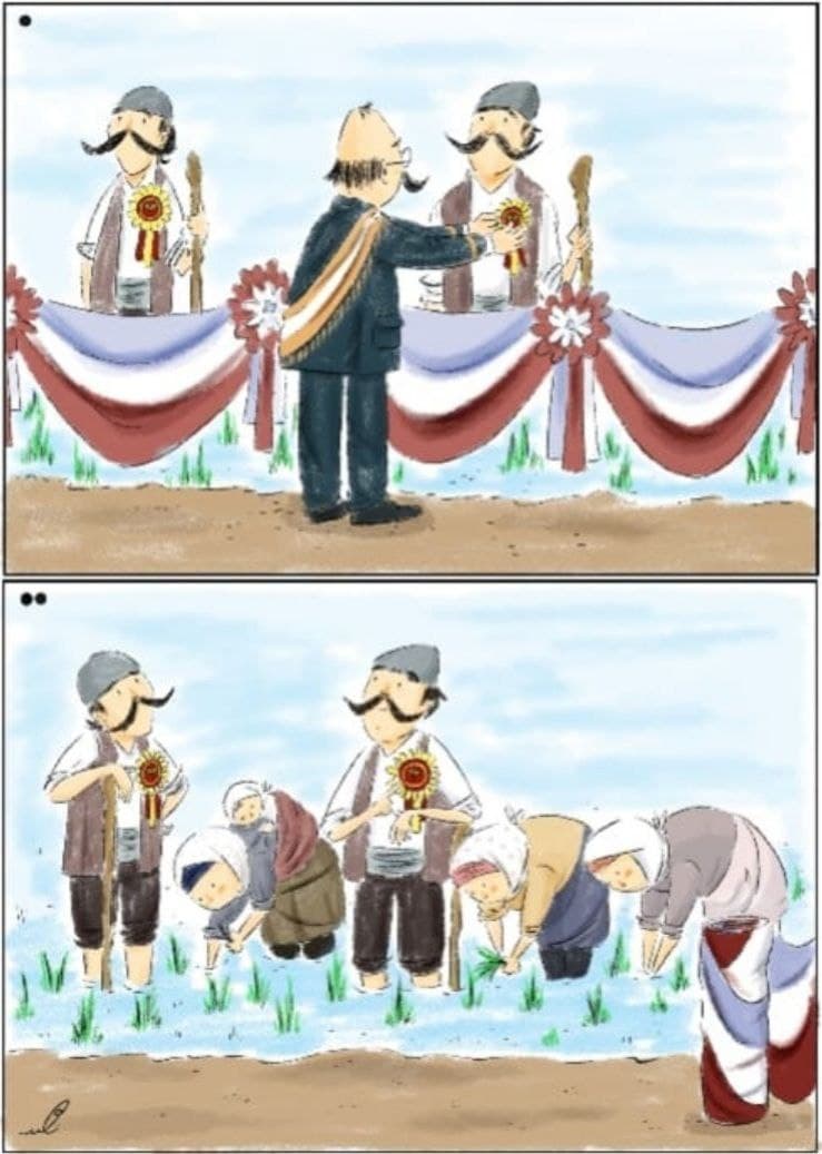 The above work that I sent to the Festival of Turkey is about gender discrimination in the workplace and women's employment. According to the latest statistics published in 2021 in Iran, 70.4% of the unemployed educated population are women, they 41% less than men! This shocking statistic was a good idea for creating my new cartoon. Women who get paid less for doing more work and their efforts are easily overlooked just because they are women. In my work you see the Iranian cultural climate, but the problem it deals with is global!